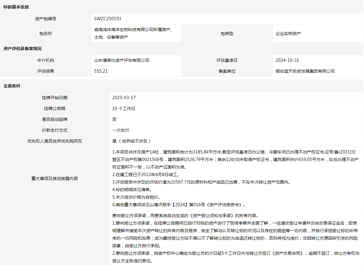 • 轉(zhuǎn)讓方:威海鴻灃海洋生物科技有限公司
